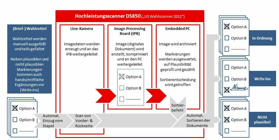 Um diese Wahlzettel zuverlässig auszählen und gleichzeitig digital archivieren zu können, benötigte der verantwortliche Wahldienstleister Hochleistungsscanner mit einem speziellen Anforderungsprofil: Die Scanner sollten pro Minute 300 beidseitig markierte Wahlzettel verarbeiten, on the flow auswerten und entsprechend in drei Fächer aussteuern können. Pro 10.000 Wahlzettel durfte dabei maximal ein Fehler auftreten. Abzug, Transport und Ablage musste auch für gefaltete und somit schwer zu beherrschende Wahlzettel gewährleistet sein. Der Aufbau des Hochleistungsscanners sollte einen definierten Workflow unterstützen, der Dokumentzuführung, Prozess-Monitoring und Dokumententnahme je einem von drei Bedienern auf drei definierten Positionen zuordnet. Weitere Anforderungen waren ein eingebauter PC mit Touchscreen und die Verifizierung der Wahlscheine durch den Scanner anhand von Infrarotmarkierungen. Der Scanner und sämtliche externe Steckverbinder und Schnittstellen mussten versiegelbar sein. Für die Zertifizierung galt es, die strengen Vorgaben des 2005 VVSG (2005 Voluntary Voting System Guidelines for Usability, Accessibility and Security Requirements) zu erfüllen. Außerdem sollte der Hochleistungsscanner so handlich konstruiert sein, dass er einen mobilen Einsatz erlaubt.